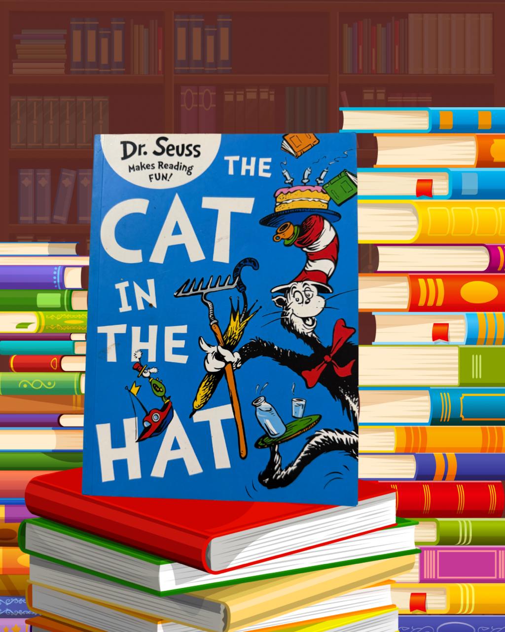 The Cat in the Hat is a 1957 children’s book written and illustrated by American author Theodor “Dr. Seuss” Geisel. The story centers on a tall anthropomorphic cat who wears a red and white-striped top hat and a red bow tie. The Cat shows up at the house of Sally and her brother one rainy day when their mother is away.